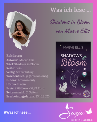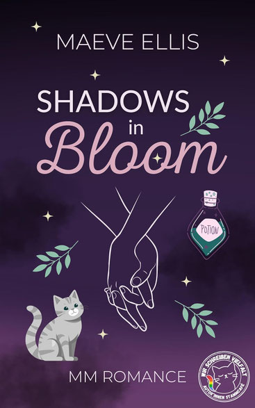 Das Cover ist lila gehalten, in rosa Schrift steht der Titel des Buches: Shadows in Bloom, sowie den Namen der Autorin: Maeve Ellis. In der Mitte des Covers sind zwei miteinander verschränkte Hände zu sehen, sowie eine Katze und ein Zaubertrank in einer Phiole. Das Genre der Kurzgeschichte ist in hellrosa Schrift mit MM Romance beschrieben.