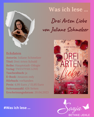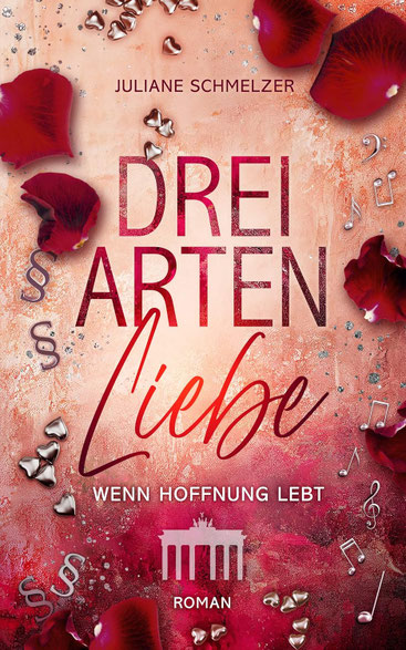 Das Cover ist nahezu identisch zum hellblauen ersten Teil, nur mit dem Unterschied, dass dieses zartrosa ist und die dunkelblauen Rosenblätter hier blutrot sind. Zusätzlich verteilt sind wieder die silbernen Figuren, die bereits wie im Vorgängerbuch die drei Hauptcharaktere widerspiegeln: Herzen für Izzi, Notenschlüssel für Dean und Paragrafen für Ben. Der Titel Drei Arten Liebe ist mit roten Buchstaben in der Mitte platziert. Der Untertitel in beige lautet: Wenn Hoffnung lebt.