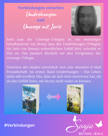 Joris (aus der Umwege-Trilogie) ist ein ehemaliger Schulkamerad von Benny (aus der Umdrehungen-Trilogie). Als Joris von Bennys schrecklichen Unfall hört, schreibt er Zita an. Das passiert deutlich vor den Ereignissen der Umwege-Trilogie.